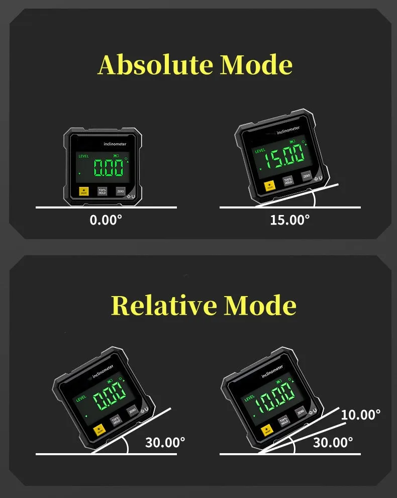 يضمن الوضع المطلق تسوية دقيقة باستخدام خط مرجعي، بينما يتيح الوضع النسبي ضبط القيمة إلى الصفر عند أي زاوية لقياسات متعددة الاستخدامات، وهو مثالي للمحترفين في مجالات البناء والنجارة والهندسة